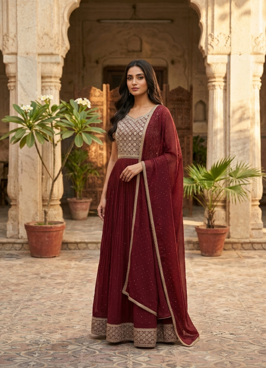 - Exude VIBE WITH OUR SHESHINE’S timeless elegance with this rich Anarkali ensemble, featuring a beautifully embroidered bodice and a gracefully flared silhouette.