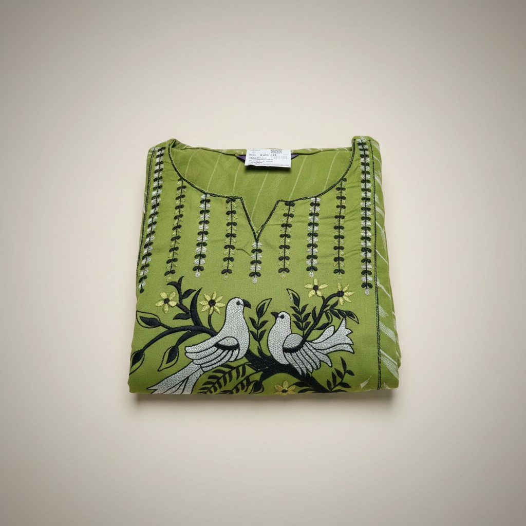Featuring a soothing green base with delicate traditional patterns, this outfit brings a calm and graceful vibe perfect for everyday wear.