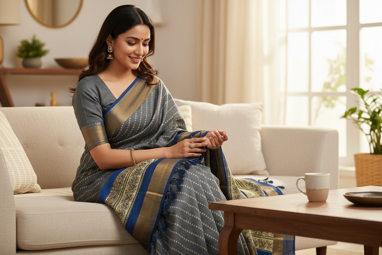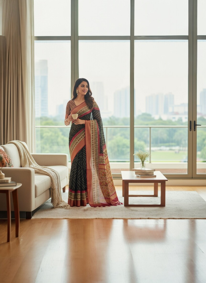- The saree features delicate geometric and traditional motifs that add depth and sophistication, making it perfect for festive occasions, casual gatherings, or office wear.