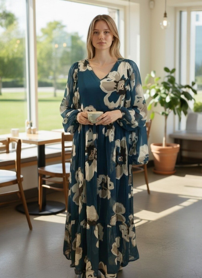 - Â Airy sleeves add a touch of grace and modesty. The full-length flowing skirt drapes beautifully, making it ideal for both relaxed daytime outings and refined evening settings.